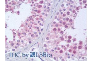 Immunohistochemistry: In paraffin embedded Human Tonsil stains nuclei in epithelial cells of tonsillar criptae. Recommended concentration: 3 μg/mL. Paraffin embedded Human Testis. Recommended concentration: 10 μg/mL.