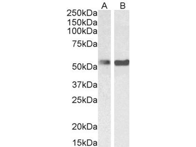 Western Blot: Approx 55 kDa band observed in Mouse Ovary lysates and in lysates of cell line NIH3T3, K562, KNRK and Nuclear Jurkat (calculated MW of 57.2 kDa according to Human NP_114368.1 and 56.9 kDa according to Mouse NP_032982.2 and Rat NP_071961.2).