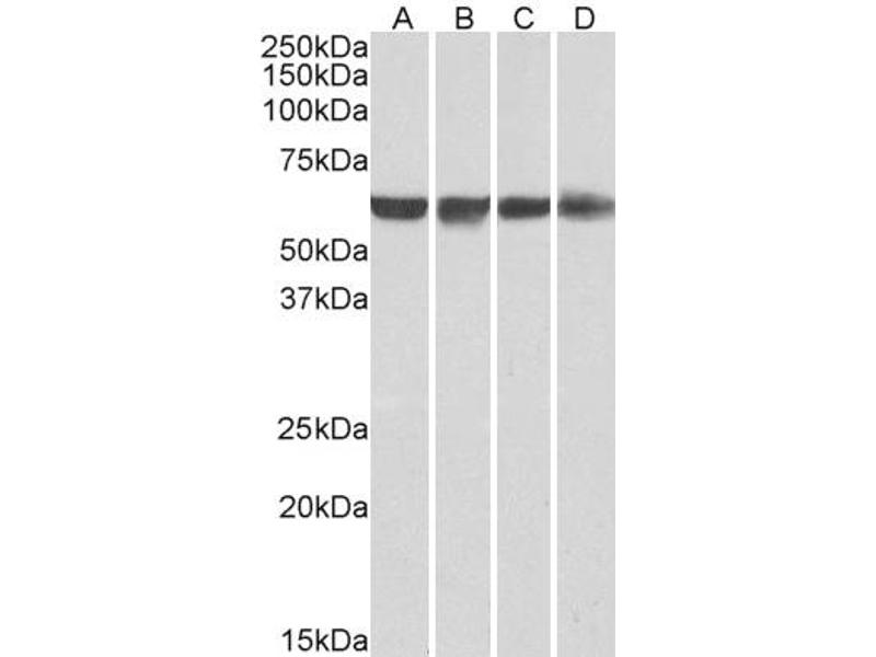 - This antibody is expected to recognise all 4 reported isoforms (represented by NP_002810.1, NP_114367.1, NP_114368.1, NP_787041.1).