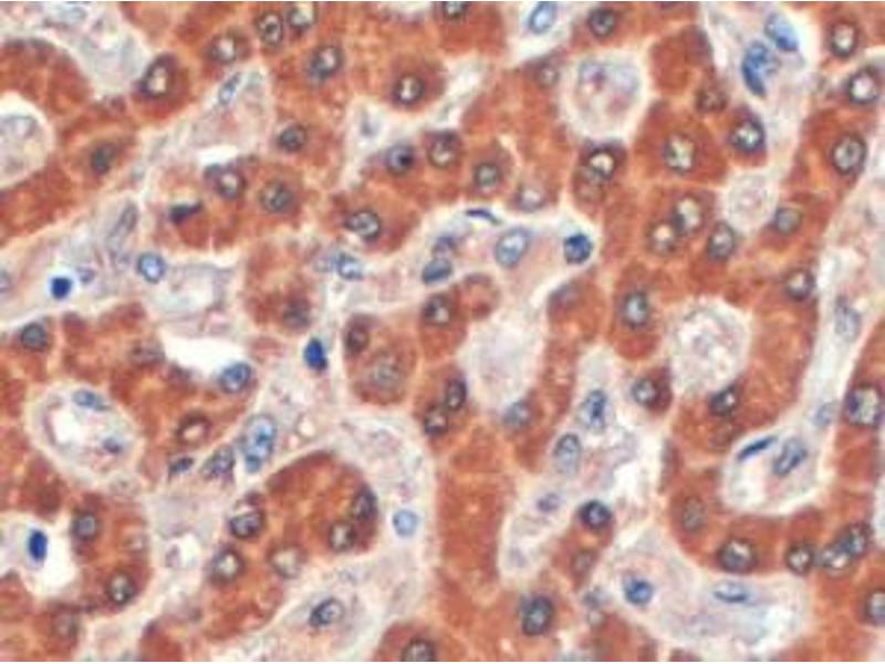 Immunohistochemistry: In paraffin embedded Human Liver shows staining of cytoplasm in hepatocytes. Recommended concentration, 4-6 μg/mL.
