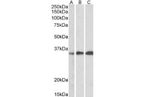 Western Blot: Approx 30 kDa band observed in Human Thymus, Human Lymph node and Human Tonsil lysates (calculated MW of 26.7 kDa according to NP_077305.2). Recommended concentration: 0.5-1.5 μg/mL. Primary incubation was 1 hour.