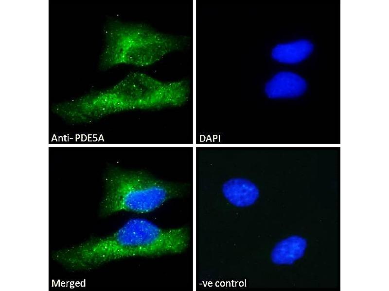 Western Blot: In transfected HEK293 transiently expressing PDE5A isoform 2 a band of approx. 95 kDa is observed. This band is not observed in the non-transfected HEK293 (calculated MW of 94.8 kDa according to isoform 2, NP_236914.2). Recommended concentrat