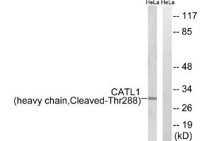 Rabbit polyclonal antibody against CATL1 protein. Specificity is as follows for the reactive species: H:T288