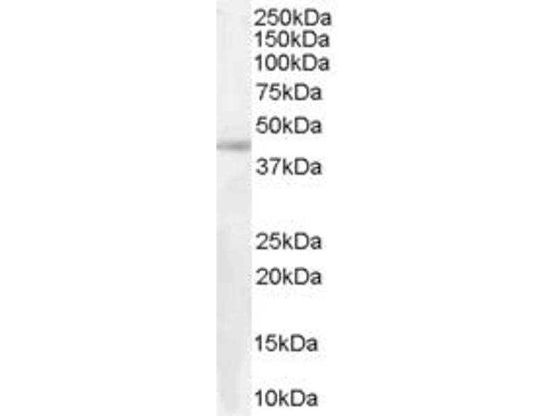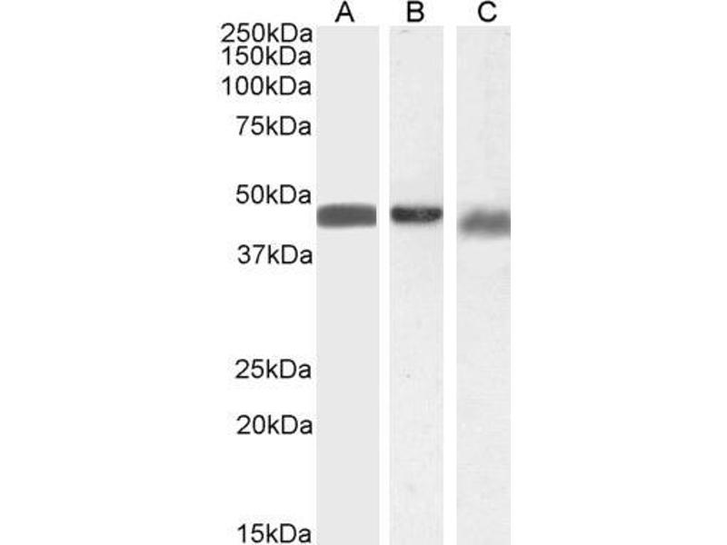 Western Blot: Approx 45 kDa band observed in lysates of cell lines A549 and U251 and in preliminary testing of KNRK cell lysate (calculated MW of 46.1 kDa according to NP_004304.1 and 44.4 kDa according to NP_945355.1) Recommended concentration: 0.5-1 μg/mL