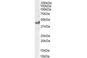 Western Blot: Approx 40 kDa band observed in Human Cerebellum lysates and in lysates of cell lines A431 and HepG2, and approx 42 kDa obseved in Human Frontal Cortex lysates (calculated MW of 40.1 kDa according to NP_001035145.1 and 43.1 kDa according to NP_0