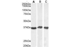 Western Blot: Approx 37 kDa band observed in Human Liver, Testis and Tonsil, and in Mouse Liver and Rat Heart lysates, and in cell lysates of HeLa and NIH3T3 (calculated MW of 36.1 kDa according to Human NP_002037.2, Mouse NP_032110.1, and Rat NP_058704.1