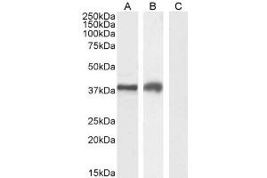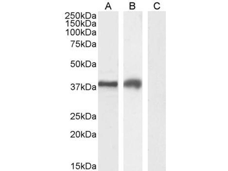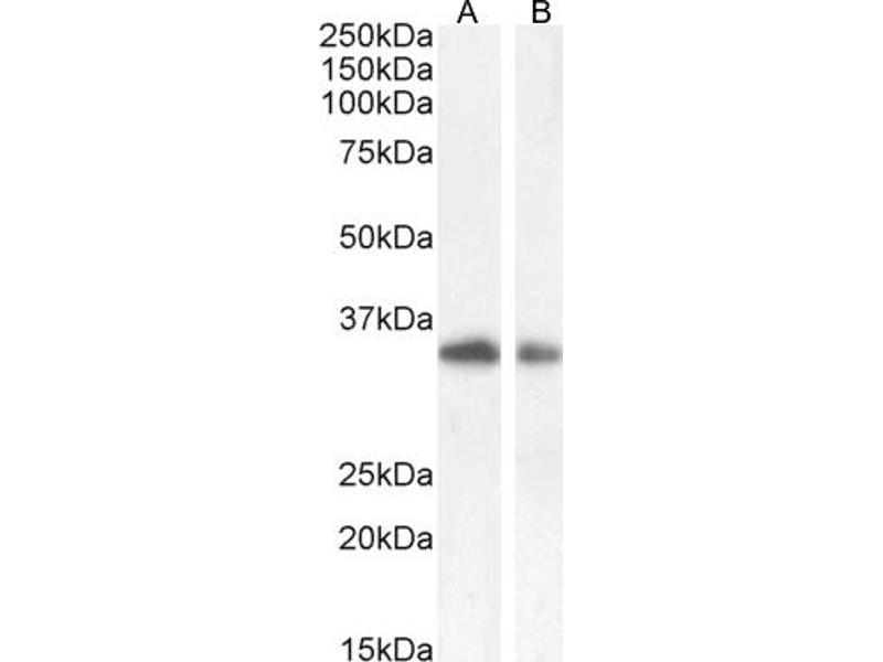 Western Blot: Approx 35 kDa band observed in lysates of cell lines A549 and HepG2 and in preliminary testing of Jurkat and U937 cell lysate (calculated MW of 33.4 kDa according to NP_116171.3). Recommended concentration:0.1-1 μg/mL. Primary incubation 1 hou