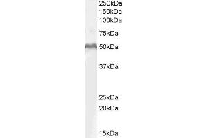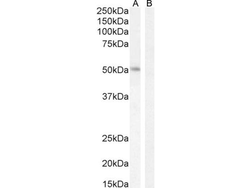 Western Blot: Approx 50--55 kDa band observed in nuclear lysates of cell line K562 (calculated MW of 44.2 kDa according to NP_057353.1)/ This molecular weight is routinely observed by other sources and was successfully blocked by incubation with the imm
