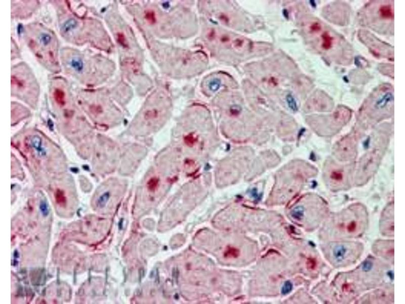 Immunohistochemistry: In paraffin embedded Human Heart shows intense staining of distinct spots in the myocardial fibres in transverse section. Recommended concentration: 2-3 μg/mL.