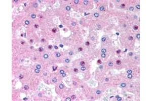 Immunohistochemistry: In paraffin embedded Human Liver shows staining of nucleoli in select hepatocytes. Recommended concentration, 2.5 μg/mL.