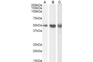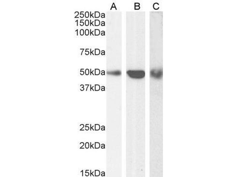 Western Blot: Approx 50 kDa band observed in Human Ovary and Mouse Testis lysates and in lysates of cell lines HepG2 and Jurkat. Preliminary testing also showed a band at approx 50 kDa in U937, NIH3T3 and HEK293 cell lysates (calculated MW of 55.9 kDa, acco