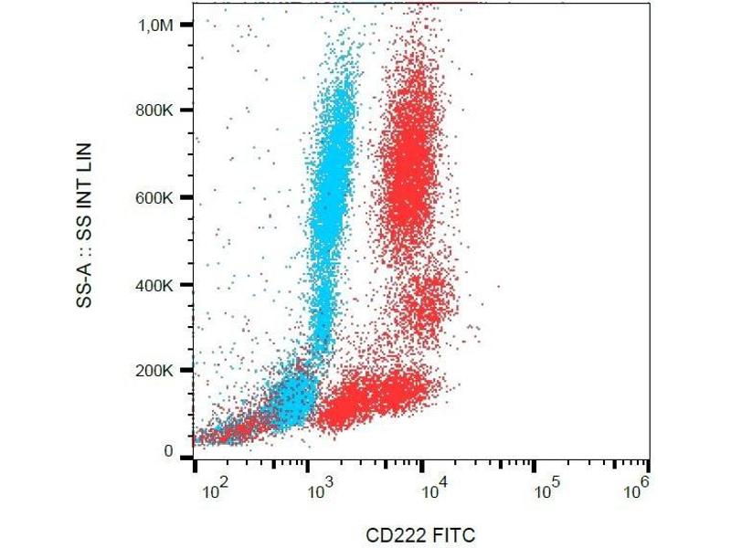 Insulin like growth factor 2 receptorprovided,CD222 (CIMPR, cation-independent mannose 6-phosphate receptor, IGF2 receptor) is a ubiquitously expressed 250 kDa transmembrane protein. No more than 10 % of CD222 is present on the cell surface where it serves as a multifunctional receptor. Intracellular (major) fraction of CD222 is involved in transport of newly synthesized lysosomal enzymes modified by mannose 6-phosphate from Golgi apparatus to lysosomes. The cell surface CD222 binds and internalizes exogeneous mannose 6-phosphate-containing ligands. Importantly, CD222 is crutial for internalization and degradation of insulin-like growth factor 2, thus controling cell growth. CD222 also complexes CD87 (urokinase-type plasminogen-activator receptor), plasminogen and latent TGF-beta, last but not least CD222 serves as a receptor for heparanase and even for Listeria.,IGF2R, MPR1, CIMPR, MPR300, M6P-R