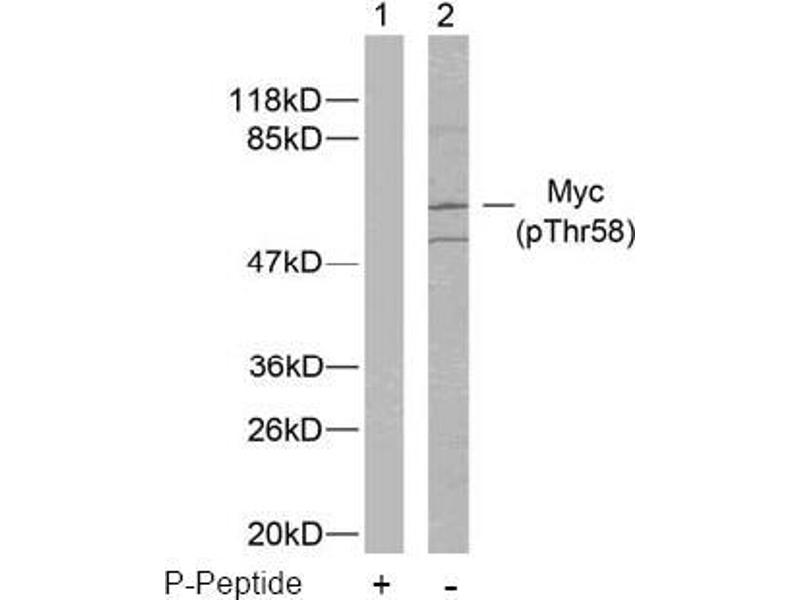 The antibody was affinity-purified from rabbit antiserum by affinity-chromatography using epitope-specific phosphopeptide. The antibody against non-phosphopeptide was removed by chromatography using non-phosphopeptide corresponding to the phosphorylation site. Myc (phospho-Thr58) antibody detects endogenous levels of Myc only when phosphorylated at threonine 58.