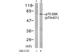 This antibody detects endogenous levels of p70 S6 Kinase only when phosphorylated at threonine 421.