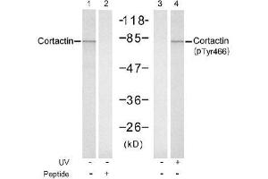 The antiserum was produced against synthesized phosphopeptide derived from mouse Cortactin around the phosphorylation site of tyrosine 466 (P-V-YP-E-T).