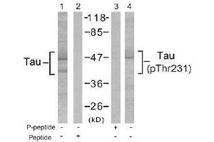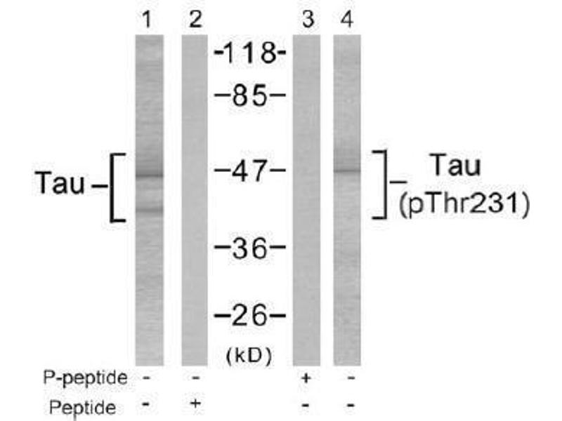 - The antiserum was produced against synthesized non-phosphopeptide derived from Human Tau around the phosphorylation site of threonine 231 (V-R-Tp-P-P).