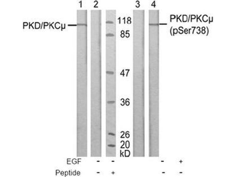 The antiserum was produced against synthesized non-phosphopeptide derived from human PKD/PKCmy around the phosphorylation site of serine 738 (E-K-Sp-F-R).