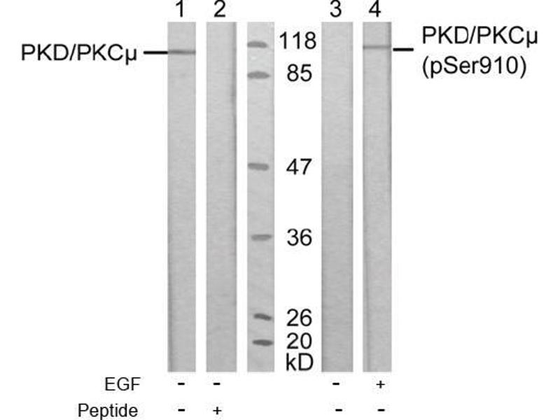 The antibody was affinity-purified from rabbit antiserum by affinity-chromatography using epitope-specific immunogen. PKD/PKCμ antibody detects endogenous levels of total PKD/PKCμ protein.