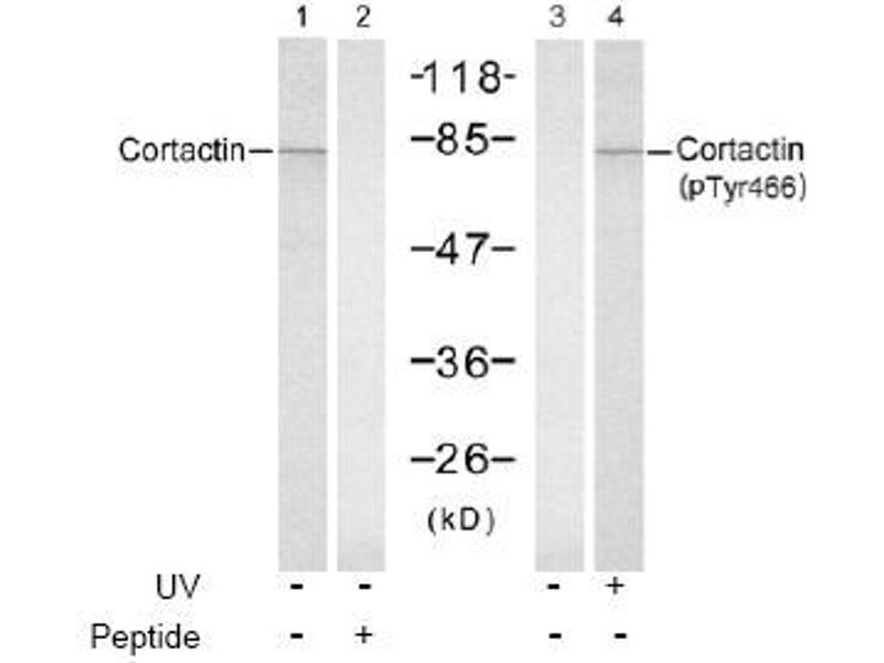 The antiserum was produced against synthesized non-phosphopeptide derived from mouse Cortactin around the phosphorylation site of tyrosine 466 (P-V-YP-E-T).