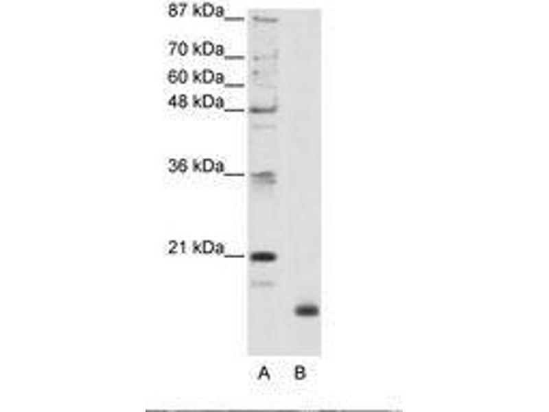 Synthetic peptide from N-Terminus of human RPL32 (P62910, NP_000985). Percent identity by BLAST analysis: Human, Chimpanzee, Gorilla, Gibbon, Monkey, Galago, Marmoset, Mouse, Rat, Hamster, Elephant, Panda, Dog, Bovine, Bat, Rabbit, Horse, Pig, Opossum, Guinea pig, Turkey, Zebra finch, Platypus (100%), Xenopus, Catfish, Sablefish, Stickleback, Pufferfish, Zebrafish (92%), Trout, Salmon, Pike (85%).