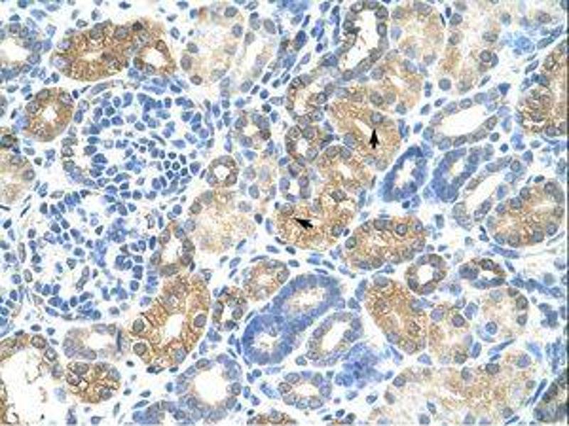 Synthetic peptide from N-Terminus of human MAFB (Q9Y5Q3, NP_005452). Percent identity by BLAST analysis: Human, Chimpanzee, Gorilla, Gibbon, Monkey, Galago, Mouse, Rat, Elephant, Bovine, Bat, Rabbit, Guinea pig (100%), Opossum, Turkey, Chicken, Xenopus, Salmon (92%), Zebrafish (90%), Marmoset, Dog, Zebra finch, Stickleback (84%).