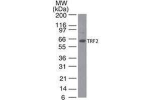 - The recognizes distinct doublet bands of approximate size 66 kD corresponding to the molecular size of huTRF2 by western blot analysis against lysates from most human cell lines.