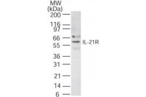 The antibody was developed by immunizing rabbits with synthetic peptides corresponding to amino acids 65-80(CSLHRSAHNATHATYT) and 505-521 (CDFTSPGDEGPPRSYLR) of human IL-21R. Percent identity by BLAST analysis: Human, Gibbon, Monkey, Marmoset (100%), Bat, Panda (88%), Hamster (81%).