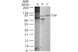 - Observed size: approx. 90 kD (native) or 80 kD (partial recombinant mouse TLR4--extracellular portion plus His-tag).