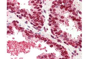 Usage: Immunohistochemistry: This antibody was validated for use in immunohistochemistry on a panel of 21 formalin-fixed, paraffin-embedded (FFPE) human tissues after heat induced antigen retrieval in pH 6.0 citrate buffer. After incubation with the primary antibody, slides were incubated with biotinylated secondary antibody, followed by alkaline phosphatase-streptavidin and chromogen. The stained slides were evaluated by a pathologist to confirm staining specificity. The optimal working concentration for this antibody was determined to be 2.5 μg/mL. -