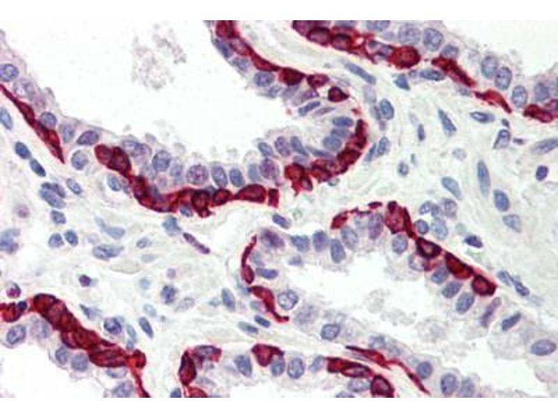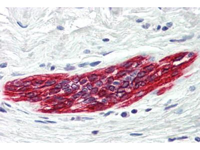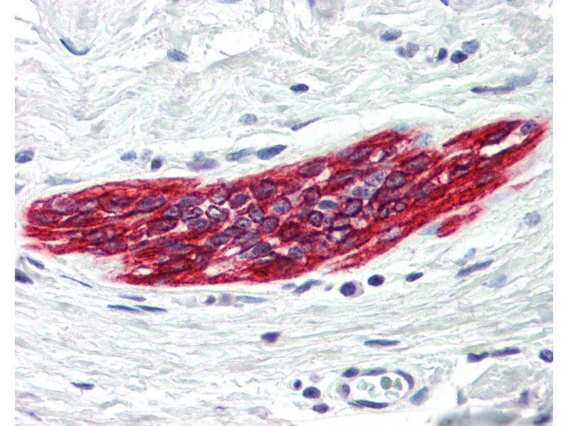 Usage: Immunohistochemistry: This antibody was validated for use in immunohistochemistry on a panel of 21 formalin-fixed, paraffin-embedded (FFPE) human tissues after heat induced antigen retrieval in pH 6.0 citrate buffer. After incubation with the primary antibody, slides were incubated with biotinylated secondary antibody, followed by alkaline phosphatase-streptavidin and chromogen. The stained slides were evaluated by a pathologist to confirm staining specificity. The optimal working concentration for this antibody was determined to be 5 μg/mL. -