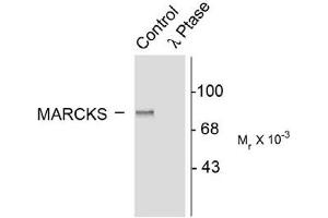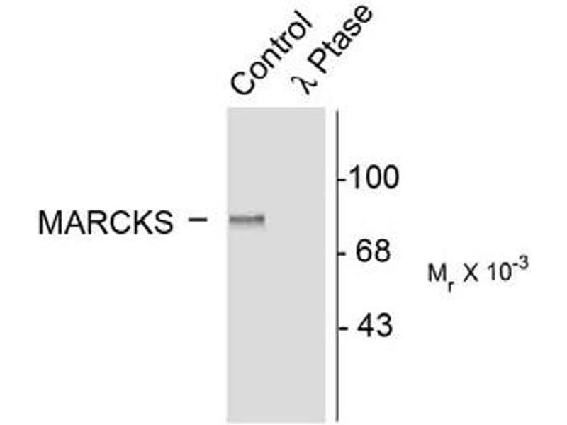 - Specific for the ~87k MARCKS protein phosphorylated at Ser152 and Ser156 in Western blots. Immunolabeling is blocked by the phosphopeptide used as the antigen but not by the corresponding dephosphopeptide. The immunolabeling is completely eliminated by X-phosphatase