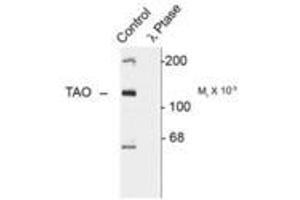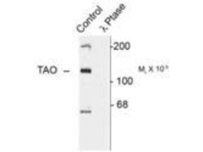- Specific for the ~120k TAO2 phosphorylated at Ser181 in Western blots. Immunolabeling is completely eliminated by treatment with X phosphatase