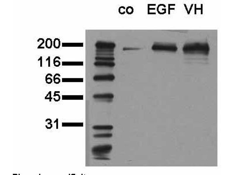 - Immunoblotting: 0.5 µg/mL for HRP/ECL detection. Recommended blocking buffer CPPT: 0.5 % (w/v) casein, 5 % (w/v) PEG 4000, 5 % (w/v) Polyvinylpyrrolidone (PVP), 0.5 % Tween 20, 10mM Tris/HCl, pH 7.4, 150mM Sodium Chloride. Phosphospecificity Whole cell extracts of control (co), EGF stimulated (EGF) or pervanadate treated (VH) A549 tumor cells were applied to SDS-PAGE (20.000 cells per lane) and transferred to a PVDF membrane. The blot was probed with 0.5- g/mL K67902M for 1 hour at RT and developed by ECL (exp. time: 30 sec). Immunoprecipitation: 1-10ug per 106 vanadate treated A431 cells. Immunocytochemistry: 1-10 µg/mL ELISA: 0.05 µg/mL Each laboratory should determine an optimum working titer for use in its particular application. Other applications have not been tested but use in such assays should not necessarily be excluded.
