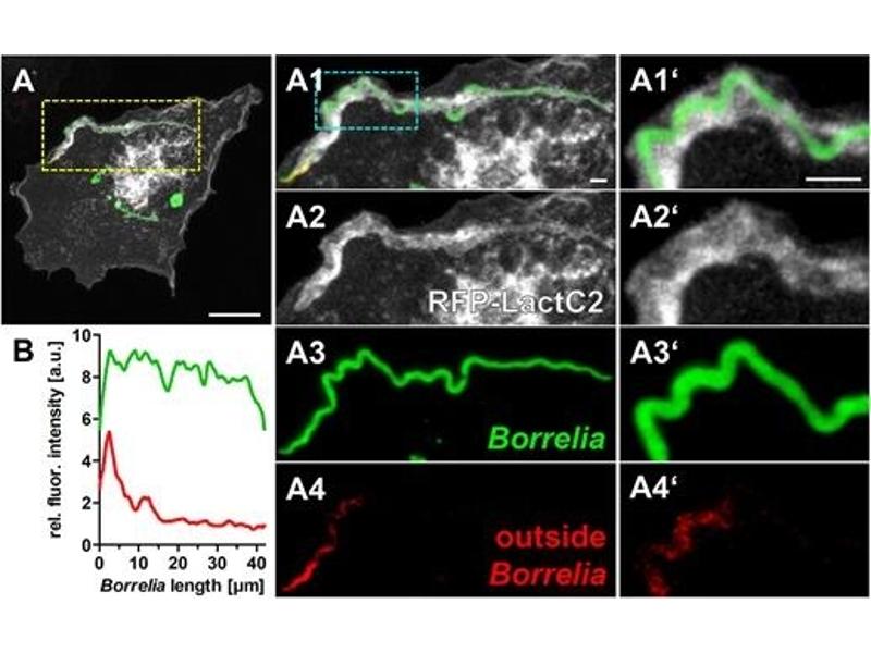 Staining of a human macrophage after infection with Borrelia burgdorferi B31. A. shows labeling of a protein associated to plasma membranes and endomembranes. B. and C. depict labeling of Borrelia burgdorferi B31 inside and outside of the cell respectively with ABIN236885. Panel D. is an overlay of all three channels.