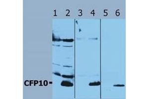 Cet anticorps anti-Mycobacterium Tuberculosis Antigen CFP10 (Rv3874) Polyclonal Lapin (ABIN238347) détecte spécifiquement Mycobacterium Tuberculosis Antigen CFP10 (Rv3874) dans WB.