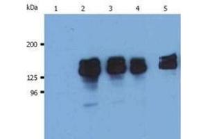 The antibody SHIP-02 reacts with SHIP-1, a phosphoinositide phosphatase largely confined to hematopoietic cells. Multiple forms of SHIP-1 have been reported with molecular weights of 110, 125, 130, 135 and 145 kDa.