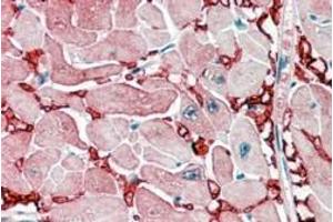 Immunohistochemistry: In paraffin embedded Human Heart shows strong staining of the capillary network between the myocardial fibres in transverse secion. Recommended concentration: 2-3 μg/mL. Paraffin embedded Human Kidney. Recommended concentration: 5 μg/