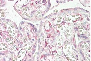 Immunohistochemistry: Paraffin embedded Human Placenta. Recommended concentration: 3.75 μg/mL.
