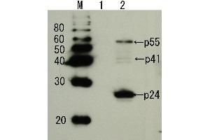 HIV-1 Gag p24 is a capsid protein that constitutes the core of AIDS virus HIV-1 and is produced by the digestion of its precursor Gag p55 by HIV-1 protease. This protein is indispensable to the reproduction of AIDS virus and constitutes an essential element for the AIDS virus particle construction. As this protein is detectable from the early stage of AIDS virus infection, it is used as a marker for observation of the patient's condition after treatment, as it indicates the amount of virus in the blood. Using this antiserum in Western blotting, the bands of 24 kD, 55 kD and 41 kD corresponding respectively to HIV-p24 and its precursors p55 and p41 were observed in the extract of the AIDS virus infected cells.