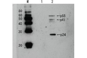HIV-1 Gag p24 is a capsid protein that constitutes the core of AIDS virus HIV-1 and is produced by digestion of its precursor Gag p55 by HIV-1 protease. This protein is indispensable to the reproduction of AIDS virus and constitutes an essential element for the AIDS virus particle construction. p24 is used as a marker antigen for observing the patient's condition after treatment, as it indicates the amount of virus in the blood. The product is prepared by immunizing rabbit with recombinant p24 protein which was over-expressed in E. coli with a plasmid carrying the Gag p24 coding region of HIV-1 virus, subtype B, and was highly purified by several steps of chromatography. Using this antiserum in Western blotting, the bands of 24 kD, 55 kD and 41 kD corresponding respectively to HIV-p24 and its precursors p55 and p41 were observed in the extract of the AIDS virus infected cells.