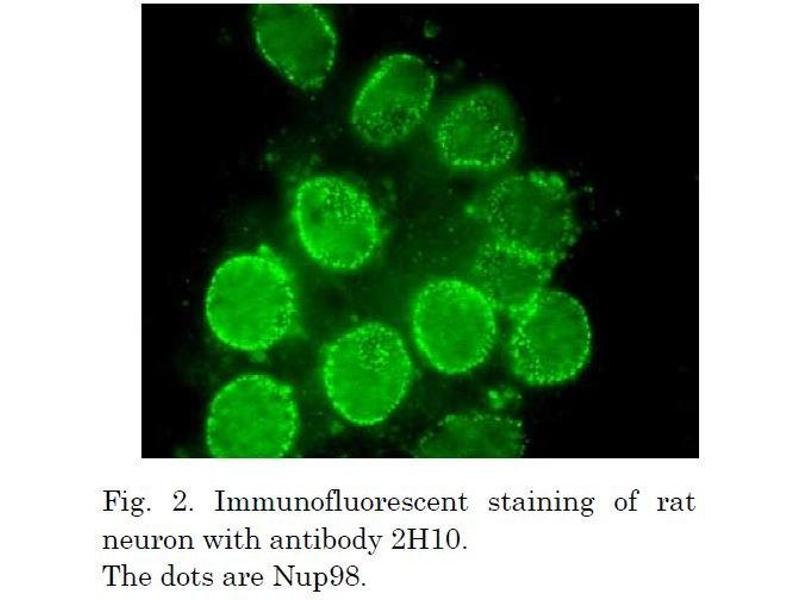 Nucleoporin 98 (Nup98) is a component of nuclear pore complex (NPC), which is a large protein assembly embedded in the nuclear envelope. It is localized on both nuclear and cytoplasmic side of NPC. This protein contains glycine-leucine-phenylalanine-glycine (GLFG) amino acid repeats and plays a critical role in nuclear trafficking. Nup98 plays a specific role in the RNA export. Nup98 gene is fused to a variety of partner genes in human myeloid and T-cell malignancies via chromosomal translocation. This hybridoma has been established by Prof. T. Tachibana's Lab. at Osaka City Univ.