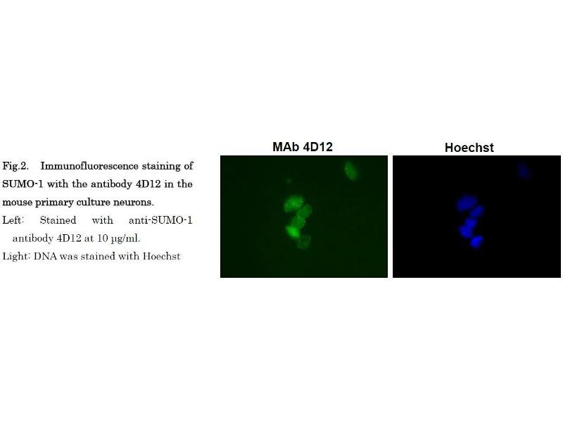 SUMO (Small Ubiquitin-like Modifier) proteins are a family of small proteins that are covalently attached to and detached from other proteins in cells to modify their function. Unlike ubiquitination, which targets proteins for degradation, SUMO modification plays a critical role in a number of cellular functions including nucleocytoplasmic transport, gene expression, cell cycle and formation of subnuclear structures such as promyelocytic leukemia (PML) bodies. There are three confirmed SUMO isoforms in human, SUMO1, SUMO2 and SUMO3. SUMO2 /3 show a high degree of similarity to each other and are distinct from SUMO1. Individual SUMO family members are all targeted to different proteins with diverse biological functions. SUMO-1 is conjugated to RanGAP, PML, p53 and IkappaB-alpha to regulate nuclear trafficking, formation of subnuclear structures, regulation of transcriptional activity and protein stability. SUMO1 is encoded as a 101 aa protein and first Met and C-terminal 4 aa are removed from the preprotein.