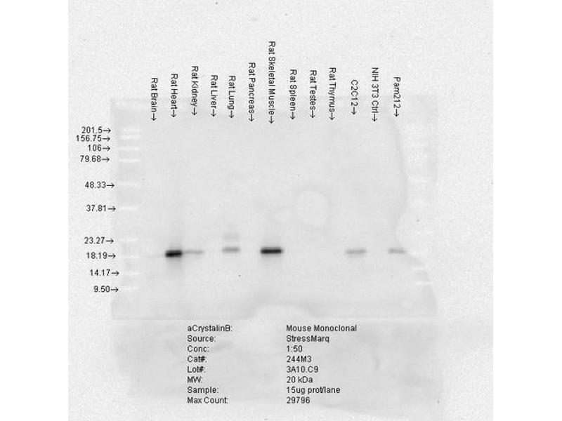 - Detects ~20 kDa (predicted mol.weight is ~21 kDa). Does not cross-react with αA-crystallin, βL-crystallin, ΒH-crystallin, γ-crystallin, HSP25, HSP27 or HSP47 proteins.