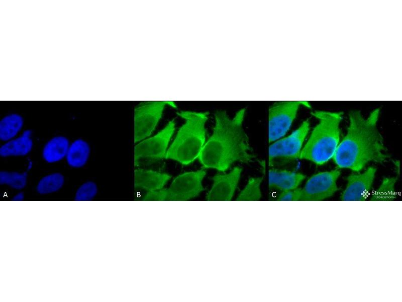 - HSP70 genes encode abundant heat-inducible 70- kDa HSPs (HSP70s). In most eukaryotes HSP70 genes exist as part of a multigene family. They are found in most cellular compartments of eukaryotes including nuclei, mitochondria, chloroplasts, the endoplasmic reticulum and the cytosol, as well as in bacteria. The genes show a high degree of conservation, having at least 50 % identity (2). The N-terminal two thirds of HSP70s are more conserved than the C-terminal third. HSP70 binds ATP with high affinity and possesses a weak ATPase activity which can be stimulated by binding to unfolded proteins and synthetic peptides (3). When HSC70 (constitutively expressed) present in mammalian cells was truncated, ATP binding activity was found to reside in an N-terminal fragment of 44 kDa which lacked peptide binding capacity. Polypeptide binding ability therefore resided within the C-terminal half (4). The structure of this ATP binding domain displays multiple features of nucleotide binding proteins (5). When cells are subjected to metabolic stress (e.g., heat shock) a member of the HSP 70 family, HSP 70 (HSP72), is expressed, HSP 70 is highly related to HSC70 (>90 % sequence identity). Constitutively expressed HSC70 rapidly forms a stable complex with the highly inducible HSP70 in cells following heat shock. The interaction of HSC70 with HSP 70 is regulated by ATP. These two heat shock proteins move together in the cell experiencing stress. Furthermore, research on HSC70 has implicates it with a role in facilitating the recovery of centrosomal structure and function after heat shock (6).