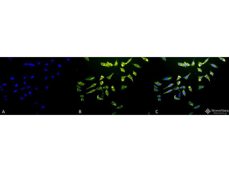 - HSP70 genes encode abundant heat-inducible 70- kDa HSPs (HSP70s). In most eukaryotes HSP70 genes exist as part of a multigene family. They are found in most cellular compartments of eukaryotes including nuclei, mitochondria, chloroplasts, the endoplasmic reticulum and the cytosol, as well as in bacteria. The genes show a high degree of conservation, having at least 50 % identity (2). The N-terminal two thirds of HSP70s are more conserved than the C-terminal third. HSP70 binds ATP with high affinity and possesses a weak ATPase activity which can be stimulated by binding to unfolded proteins and synthetic peptides (3). When HSC70 (constitutively expressed) present in mammalian cells was truncated, ATP binding activity was found to reside in an N-terminal fragment of 44 kDa which lacked peptide binding capacity. Polypeptide binding ability therefore resided within the C-terminal half (4). The structure of this ATP binding domain displays multiple features of nucleotide binding proteins (5). When cells are subjected to metabolic stress (e.g., heat shock) a member of the HSP 70 family, HSP 70 (HSP72), is expressed, HSP 70 is highly related to HSC70 (>90 % sequence identity). Constitutively expressed HSC70 rapidly forms a stable complex with the highly inducible HSP70 in cells following heat shock. The interaction of HSC70 with HSP 70 is regulated by ATP. These two heat shock proteins move together in the cell experiencing stress. Furthermore, research on HSC70 has implicates it with a role in facilitating the recovery of centrosomal structure and function after heat shock (6).