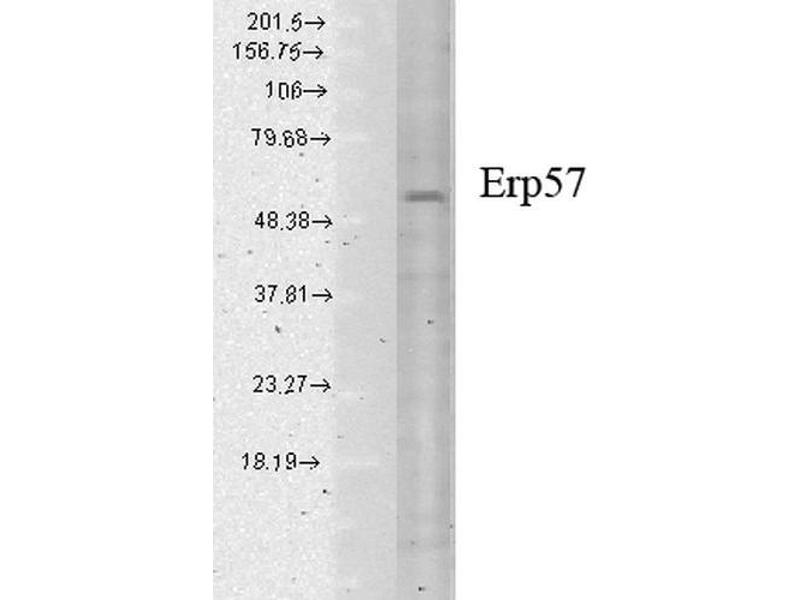 - ERp57, also known as Glucose Regulated Protein 58 (Grp58), Hormone-Induced Protein-70 (HIP-70) and microsomal Carnitine Palmitoyltransferase, is a member of the protein disulfide isomerase family, containing two canonical CXHC tetrapeptide active site motifs (1-5). It has quite a few diverse roles. It functions as an accessory oxidoreductase involved in disulfide bond formation. In the ER, ERp57 interacts with membrane bound calnexin and soluble calreticulin (lectin chaperones) via their praline rich P-domain arms. Lectin chaperones bind nascent non-native glycoproteins, and position ERp57 to act upon the immature or misfolded glycoproteins that possess mono-glycosylated side chains. ERp57 deletion impairs posttranslational phases of influenza hema-glutinin folding, and causes accelerated release of MHC-I molecules, resulting in the coupling of sub-optimal peptides and reduced expression and stability on the cell surface (6). ERp57 also contains two thioredoxin active-site sequences, CGHC and an estrogen-binding domain. ERp57 is induced by both estrogen and leuteinizing-hormone-releasing hormone in the hippocampus (7).