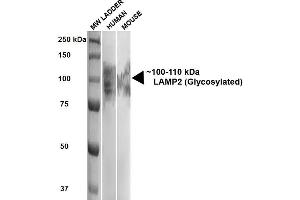 1 μg/ml of ABIN2484600 was sufficient for detection of LAMP2 in 20 μg of rat liver microsomes by ECL immunoblot analysis using Goat anti-mouse IgG:HRP as the secondary antibody.