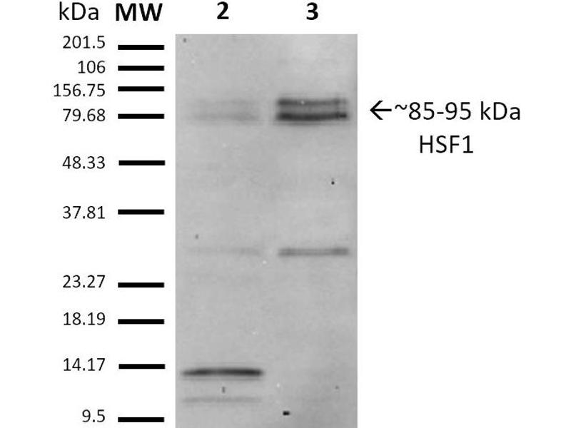 1 μg/ml of ABIN2484626 was sufficient for detection of HSF1 in 20 μg of heat shocked HeLa cell lysate by ECL immunoblot analysis using Goat anti-rat IgG: HRP as the secondary antibody