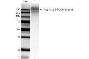 - Binds selectively to a BSA-conjugated alginate, but not to unconjugated BSA.
