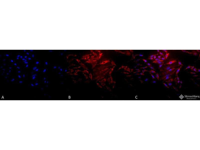 1 μg/ml of ABIN2486148 was sufficient for detection of HSP60 in 20 μg of heat shocked HeLa cell lysate by colorimetric immunoblot analysis using goat anti-mouse IgG as the secondary antibody.